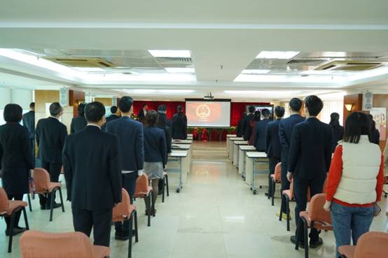 ledong乐动网页升国旗仪式现场,全体参会员工起立奏唱国歌