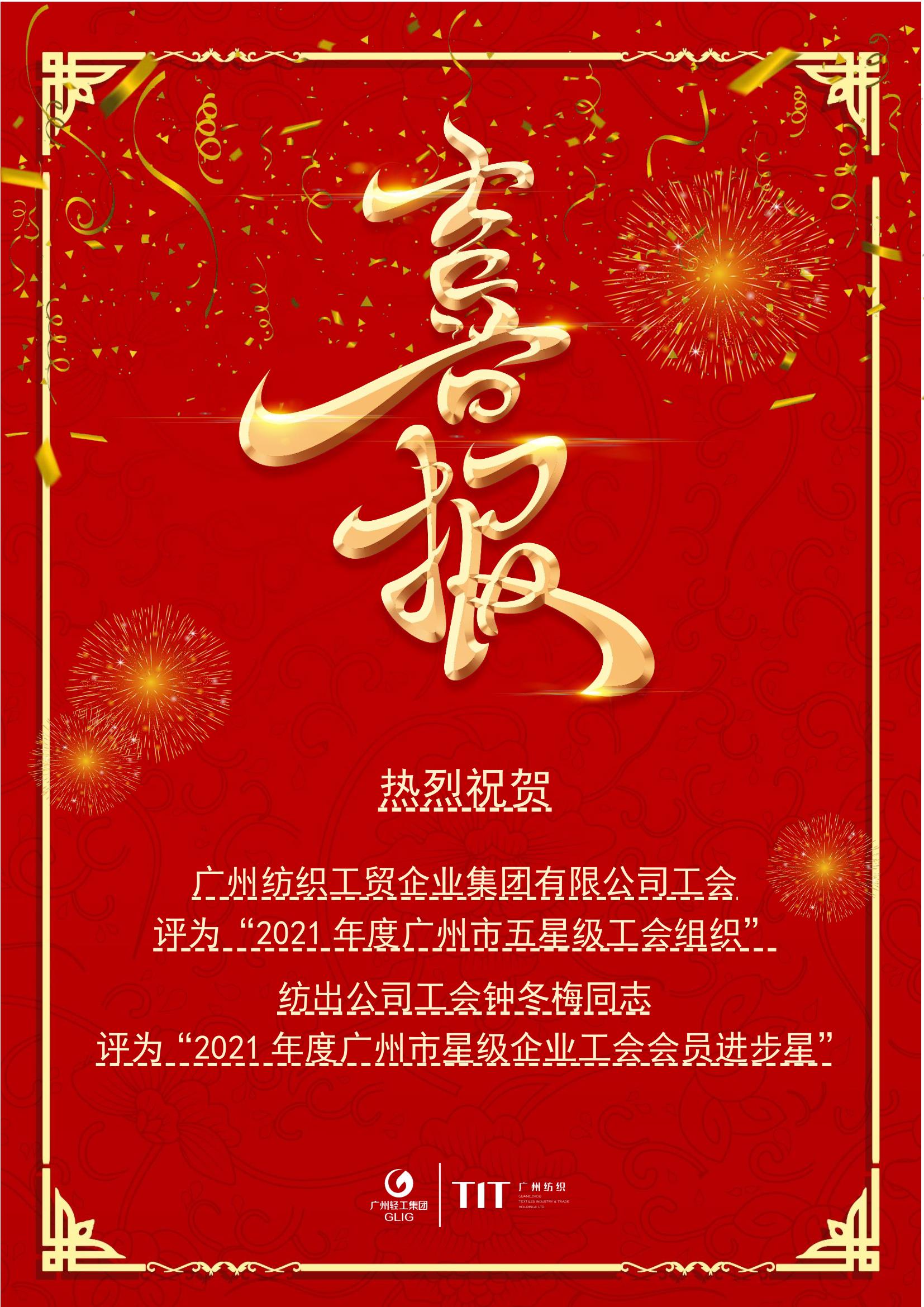 喜报:热烈祝贺ledong乐动网页工会评为“2021年度广州市五星级工会组织”、纺出工会钟冬梅同志评为“2021年度广州市星级企业工会会员进步星”