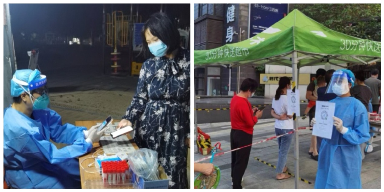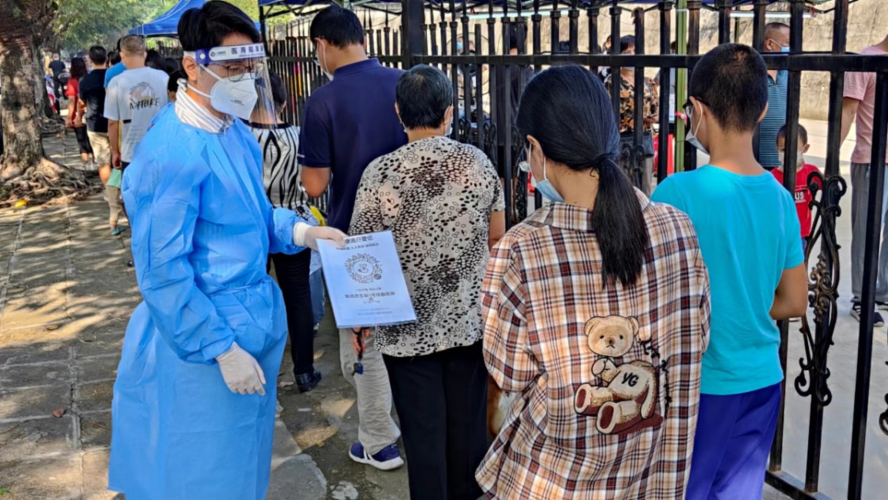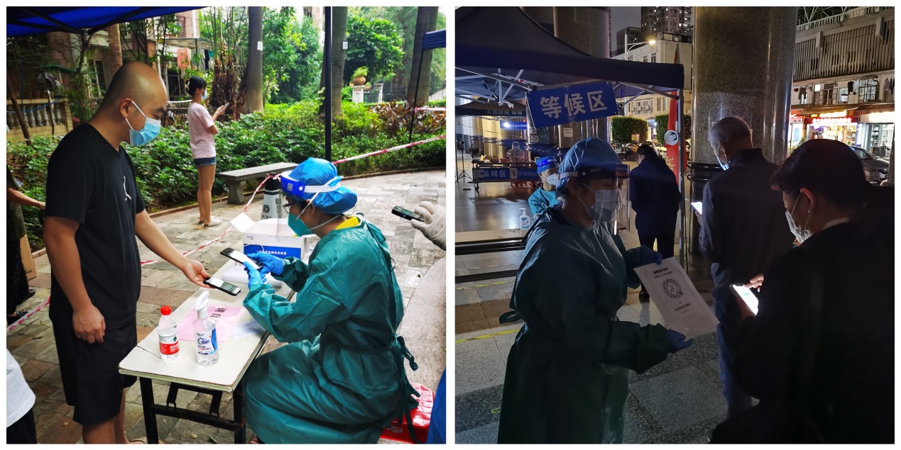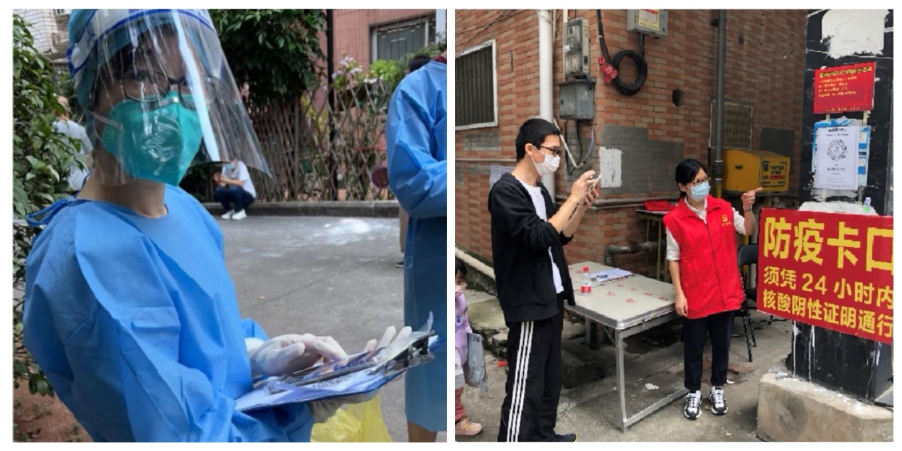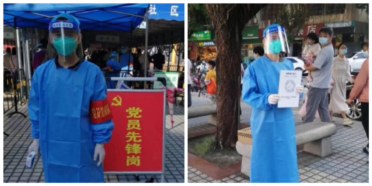 广纺检测纪检专员廖泳湖协助社区完成2000余居民测量体温、指引居民扫场所码、查验健康码等工作,连续服务4个多小时。
