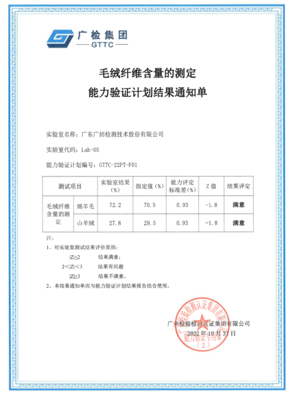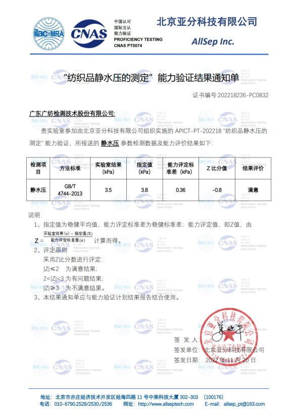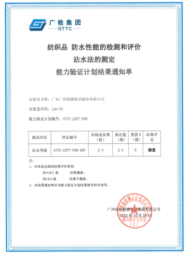 广东广纺检测技术股份有限ledong乐动网页接连收到广州检验检测认证集团组织的“GTTC-22PT-F01 毛绒纤维含量的测定、GTTC-22PT-F06 纺织品防水性能的检测和评价、GTTC-22PT-F20 皮革pH值的测定”等三项能力验证满意结果。同时,又收到北京亚分科技有限ledong乐动网页组织的 APICT-PT-202218 “纺织品静水压的测定”能力验证结果满意。