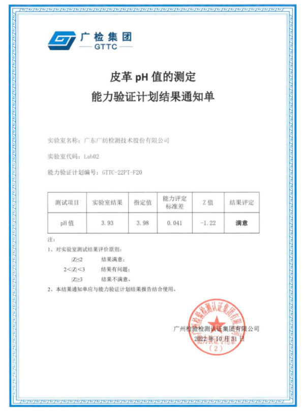 此次能力验证结果满意充分反映了广纺检测不仅在纺织品特种动物纤维检测、纺织品防水性能等检测方面拥有良好的技术能力,在皮革有害物质的检测方面也具有较高技术水平,能为客户提供准确可靠的检测服务。