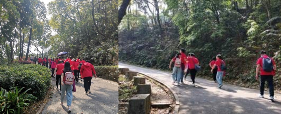 帽峰山上林莽苍苍,登高路上欢声笑语,红色文化衫队伍浩浩荡荡,在崎岖的山道不断向上延伸,与青山绿树融为一体、相得益彰。在最后的登顶冲刺过程中,有人如履平地、健步如飞,有人气喘吁吁、满头大汗,大家互相扶持,加油打气,最终凭借着团队的力量成功到达山顶广场。