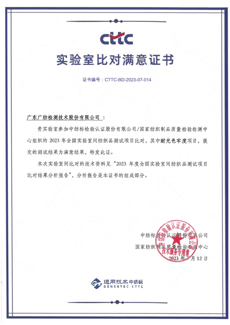 近日,广纺检测参加2023年全国实验室间纺织品比对试验项目“耐光色牢度”结果出炉,广纺检测再次获得“满意结果”。