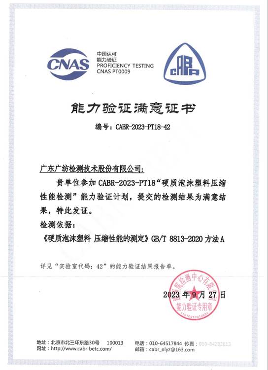 近日,广东广纺检测技术股份有限ledong乐动网页收到国家建筑工程质量检验检测中心(建研院检测中心有限ledong乐动网页)组织的“硬质泡沫塑料压缩性能的测定”能力验证结果满意证书。