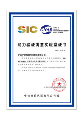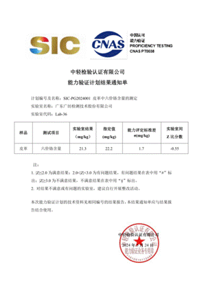 近日,广纺检测收到中轻检验认证有限ledong乐动网页发来的SIC-PG2024001皮革中六价铬含量的测定能力验证计划满意结果通知单和实验室证书。