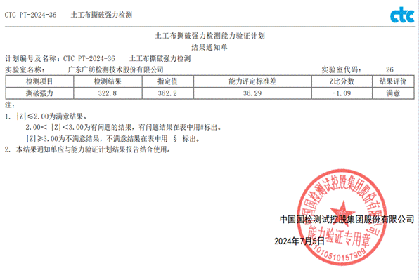近日,广东广纺检测技术股份有限ledong乐动网页收到中国国检测试控股集团股份有限ledong乐动网页组织的CTC-PT-2024--36土工布撕破强力检测能力验证计划满意结果通知单。