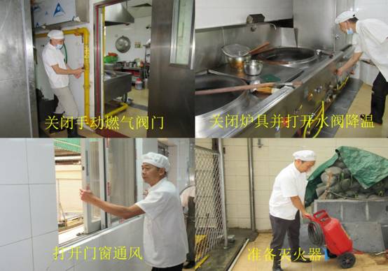 演练模拟饭堂工作人员在做饭过程闻到燃气异味,燃气自动关闭装置暂未有动作,于是立即出来报告,并顺路关闭手动燃气阀门。其他饭堂工作人员也随即关闭燃气炉具,相互提醒严禁触摸电器开关,打开炉具专用水阀放水降温,在撤退过程准备好灭火器,打开窗户透气。现场控制组在接到应急指挥中心的命令后,对饭堂出入口拉起警戒线,接上消防水带模拟对现场降温,对需要进入泄漏区关闭上端燃气阀门的排险人员,确认没有穿带钉鞋和化纤衣服,没有携带使用金属工具。