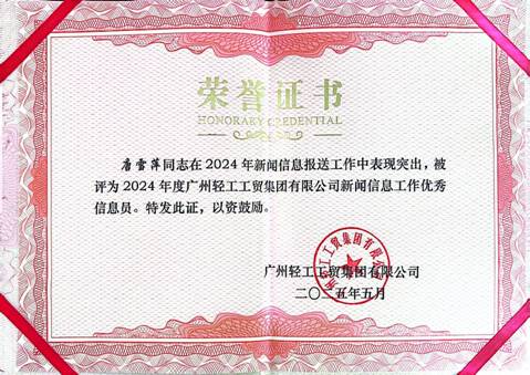 5月8日,广州轻工集团2025年新闻信息工作会议对2024年度新闻信息工作先进单位和先进个人进行了表彰。纺织ledong乐动网页荣获“2024年度广州轻工工贸集团有限ledong乐动网页新闻信息工作先进单位”称号,唐雪萍、常阳被评为“2024年度广州轻工工贸集团有限ledong乐动网页新闻信息工作优秀信息员”。