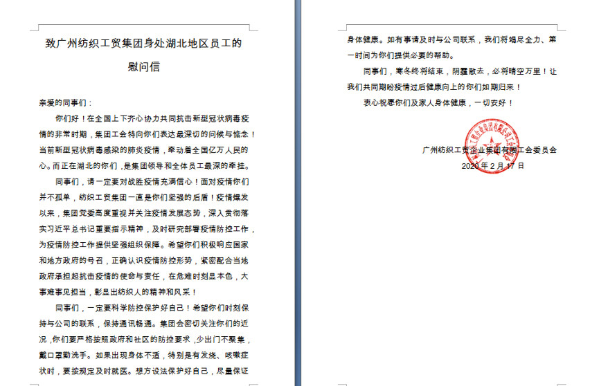 集团工会自2月17日发出《广州纺织工贸集团湖北籍及身处湖北地区员工的慰问信》,向9名身处湖北地区的员工们转达了集团领导和全体员工对疫区同事最深的牵挂,鼓励他们要充满信心,一定能战胜疫情,后方温暖大集体是他们的依靠,等着他们安全归来!