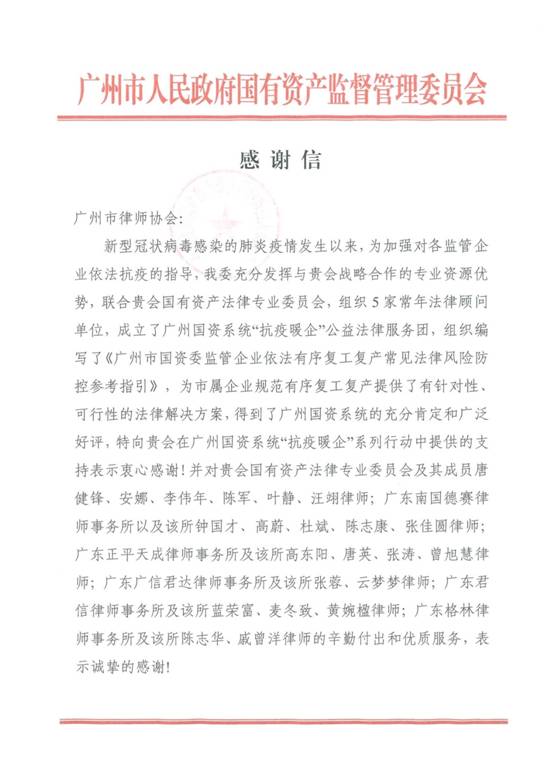 服务:充分发挥专业优势,助力复工复产。纺织ledong乐动网页汪翊律师作为广州市律师协会国有资产法律专业委员会的成员之一,积极投身广州国资系统“抗疫暖企”公益法律服务团,参与编写了《广州市国资委监管企业依法有序复工复产常见法律风险防控参考指引》, 并得到广州市国资委的诚挚感谢。