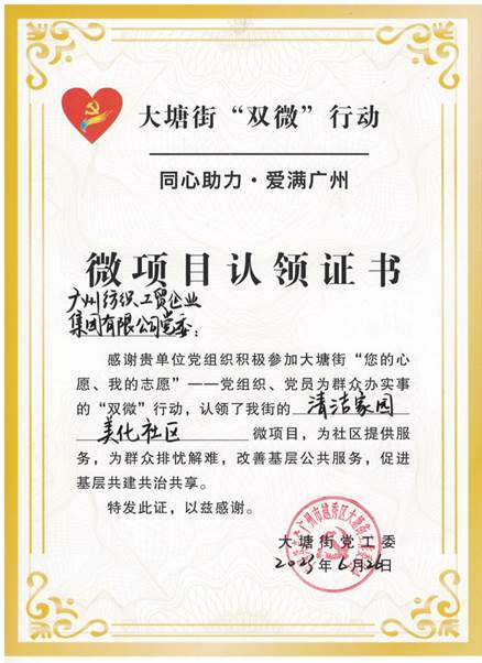 6月26日,越秀区大塘街党工委、办事处以“党建引领聚合力、共谱高质量发展新篇”为题举办主题表彰大会暨文艺演出活动。会上,纺织ledong乐动网页党委获大塘街党工委颁发“清洁家园 美化社区”微项目证书,这是大塘街对纺织ledong乐动网页党委充分发挥党建引领作用、积极履行社会责任的肯定。
