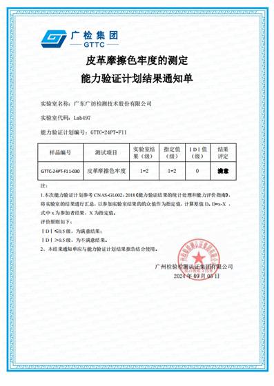 近日,广东广纺检测技术股份有限ledong乐动网页收到广州检验检测认证集团有限ledong乐动网页组织的GTTC-24PT-F11皮革摩擦色牢度的测定能力验证结果满意通知单。